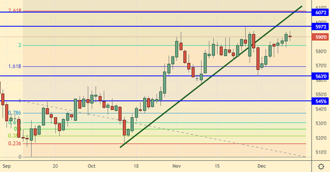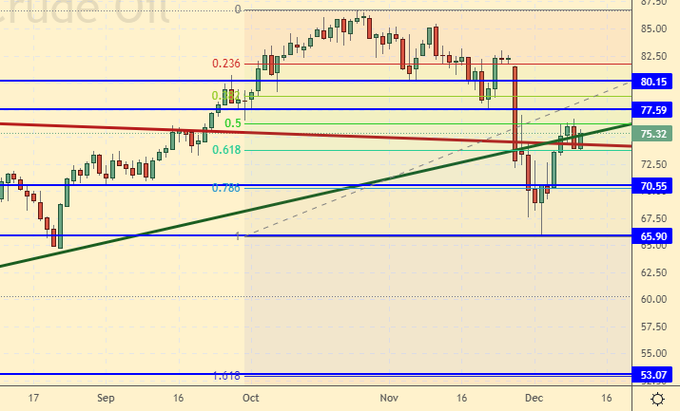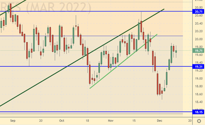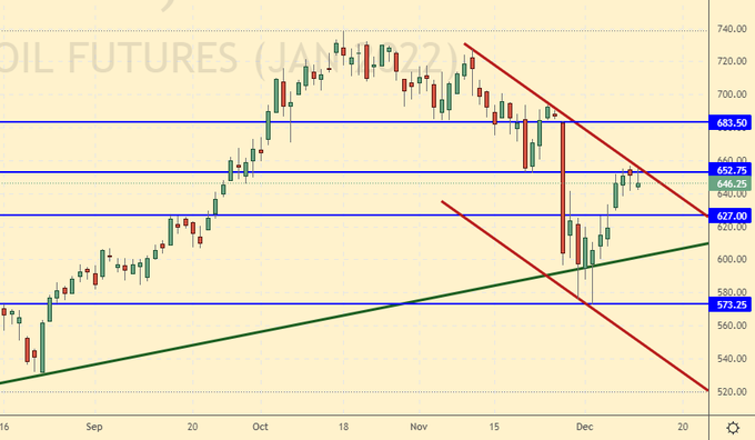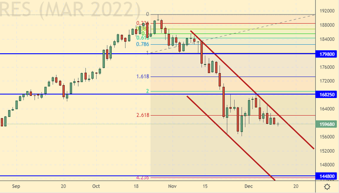 Over the past week, 12/01/21 — 12/07/21, the difference between long and short positions of managers decreased by 5.3 thousand contracts. At the same time, speculators left the market. Bulls, stronger than bears, have reduced their positions. Growth scenario: December futures, expiration date December 31. There are slight hints of growth, but we will continue to refrain from shopping. I would like to see the 60.00 level.
