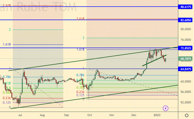 Growth scenario: from 65.00 we will definitely buy. It is possible that we will go to this mark for several days, so you should be patient. If the market returns above 73.00 without reaching the level of 65.00, you will have to buy, as there are targets at 83.00 and 85.00 rubles per dollar above.