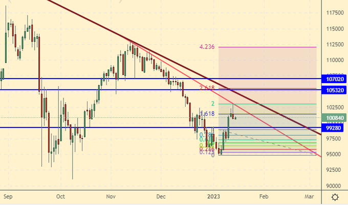 Growth scenario: we consider the March futures, the expiration date is March 16. We were unable to go above the 103000 level right away. There may be another attempt, but it will be incredibly difficult to push the market above the 105000 level. For now, we refuse to enter the long.