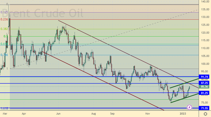 Growth scenario: switched to March futures, expiration date February 21. Quotes are growing rapidly. We continue to keep longs open a week earlier. In case of growth above 84.00, positions can be increased.