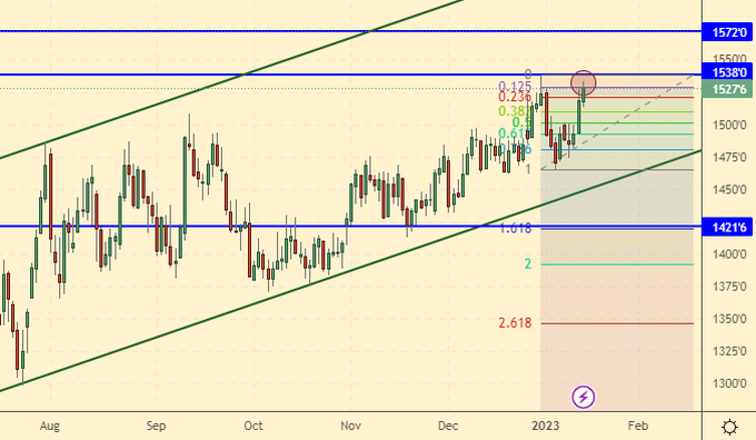 Growth scenario: we consider the March futures, the expiration date is March 14. There are big doubts about the ability to break above 1550. Let’s push the stop order to the current levels.