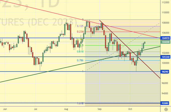 Reading our forecasts, you could take a downward move on the RTS index from 105800 to 102600.