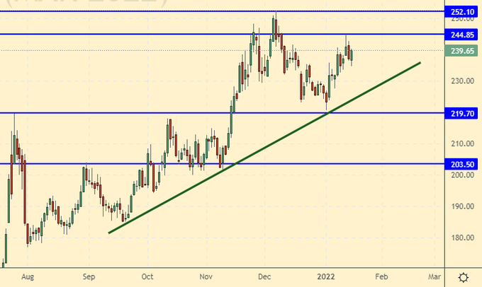The January USDA report did not make much of an impression on traders. Data on the gross harvest of wheat and corn came out almost unchanged. It is possible that in January Argentina and Brazil will receive less moisture due to the La Niña effect and this will create problems for corn and soybeans, but on a global scale, the drop in volumes will not be strong. Passion for the «omicron» has faded into the background as the disease is more easily tolerated than in the case of the original COVID-19 virus.