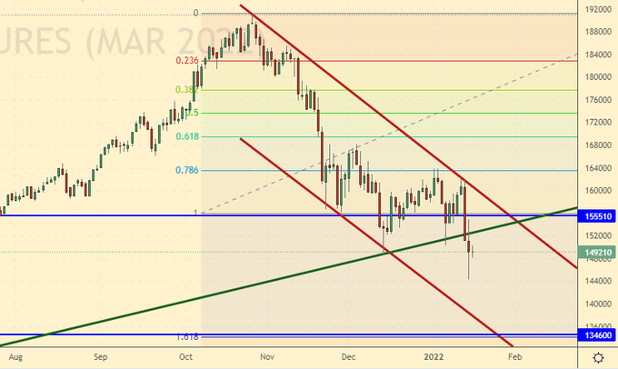 Falling scenario: what will Moscow do after it is denied agency for the whole world next week, that is the question. And no one has an answer. Let’s hope that the strategists who started the story with a public ultimatum to the West in December have it. And since the plans of the government are not known to us, we look at the technical picture, and there are only shorts on it. So we will sell.