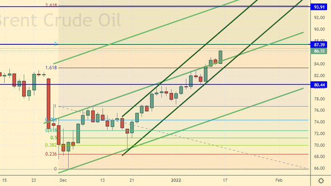 Growth scenario: January futures, the expiration date is January 31. The mark 93.90 has opened at the top. We will count on a touch of 87.30, after which a rollback to 82.50 should follow, and only then the growth will continue.