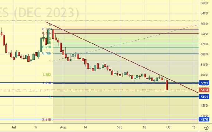 Growth scenario: we are considering December futures, expiration date is December 14. Friday’s red candle is scary, so we will not recommend buying from 540.0 as we did before. You need to buy from 515.0, and even more so from 430.0.