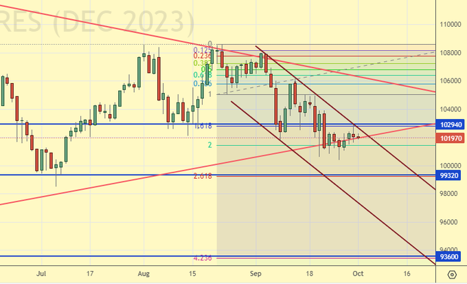 Fall scenario: we will continue to hold shorts from 105800 and 105000. The bears need to crack the area of 99000 – 100000 in order to take over the market for many months (years?!).