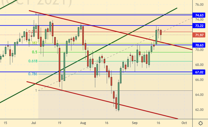Growth scenario: November futures, the expiration date is October 20. Prices did not manage to close above 73.00, which gives rise to some doubts about the growth, but in general, the situation is behind the bulls.
