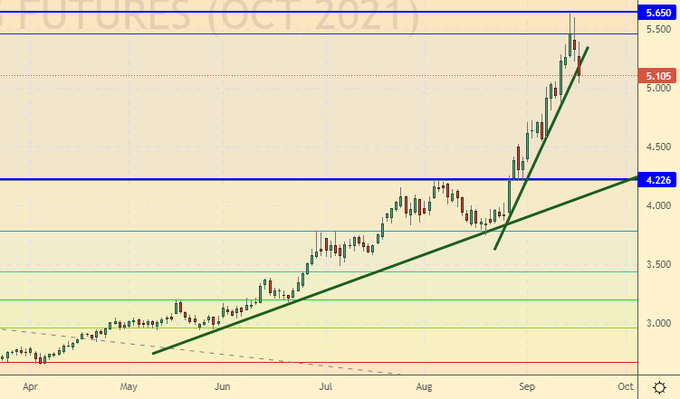 Growth scenario: October futures, expiration date September 28. The market reached our target at 5.40. If there is a rollback to 4.20, you can buy again. The gas situation in Europe will be difficult for the entire heating season.