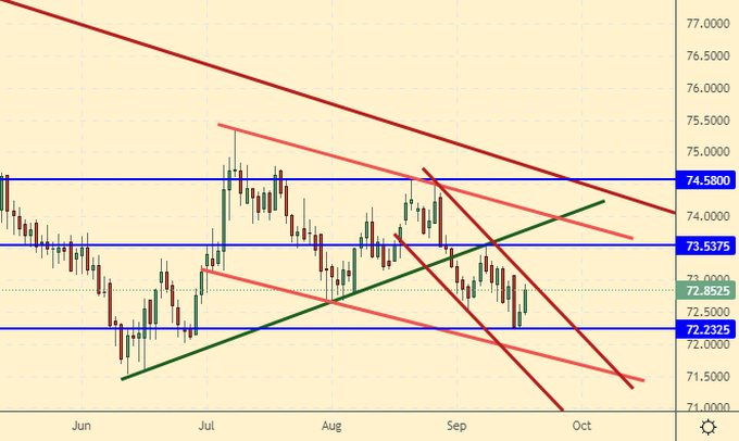 Growth scenario: the dollar strengthened slightly at the end of the week, but it is too early to talk about a change in sentiment. Nevertheless, those who wish can buy if the pair rises above 73.00.