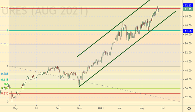 Growth scenario: August futures, the expiration date is July 20. We switched to August futures. By the Fibonacci levels, we see that the upward impulse is complete. Yes, there is an option to move to 96.00, but before this action I would like to see a pullback to at least 64.00.