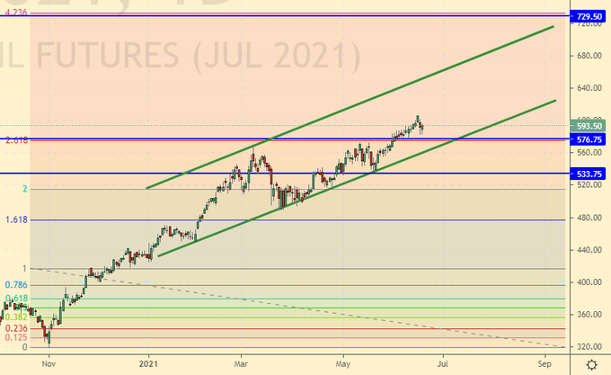 Growth scenario: July futures, expiration date July 14. The buyers did not hold the situation and sagged. The engulfing combination of the last two daily candles from 637.0 does not cause much emotion, since there is a threat of a breakdown of the extended support line. Sellers won’t just give up. Out of the market.