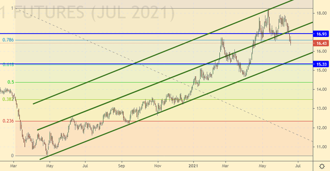 Growth scenario: July futures, expiration date June 30. They did the right thing that they did not buy for a month. Here we have a correction, which is very likely to reach 15.33. We will think there.