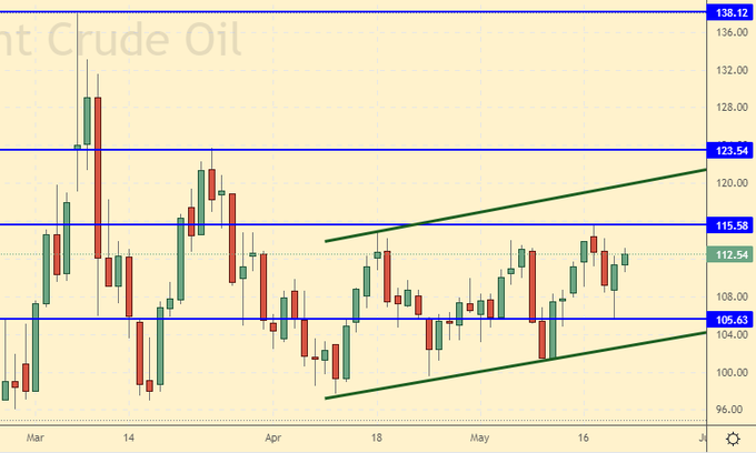 Growth scenario: we are considering the July futures, the expiration date is June 21. We will keep open last week longs. In case of a break above 117.00, you can add.