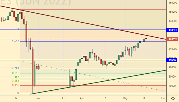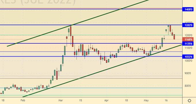 For wheat, the level of 1400 cents per bushel remains in sight. For corn, we are able to go to the level of 870 cents per bushel. These upward moves can take place in June or later. Much will depend on the discrepancy between the current, generally positive market expectations for gross output, and the actual picture. The market is not visible above the above mentioned marks, since further demand will simply fall due to banal famine in a number of countries, as people will not be able to afford bread at a price that has tripled compared to last year.