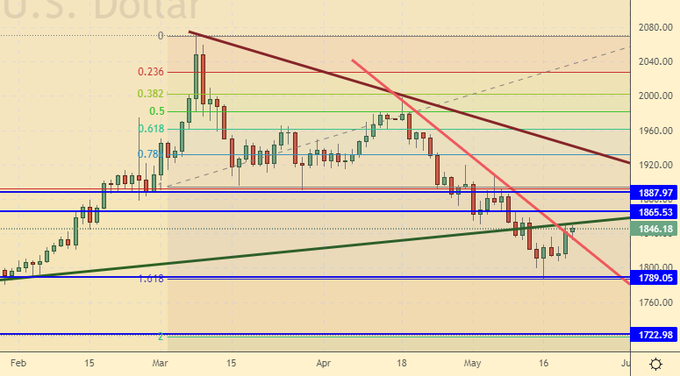 Growth scenario: we consider the July futures, the expiration date is July 14. It is possible that the market will try to test 1800.0. Unfortunately, the current levels are not interesting for purchases. Out of the market.