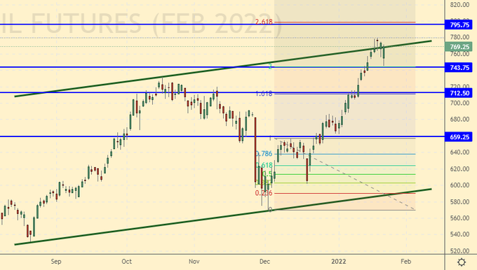 Growth scenario: February futures, the expiration date is February 10. We will not buy. Most likely, the market will reach 795.0 after which the fall will begin.
