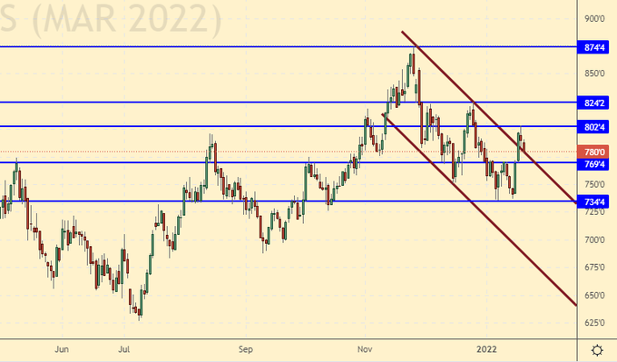 Growth scenario: March futures, the expiration date is March 14. The bulls were able to take the market above 800.0, even if only for a moment. We continue to hold longs.