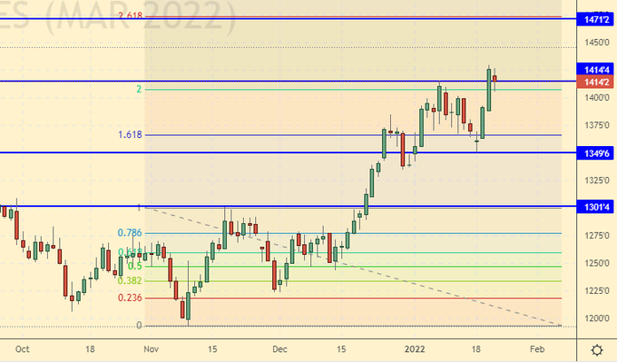 Falling scenario: they will talk to us, this is already evident. The only question is in what tone. Hardly very formidable. The big game has begun in Europe. The Russian economy may suffer from sanctions from the EU and Washington, so investors are forced to take into account the negative developments at this stage. Let’s keep the shorts. We have targets below at 103000 and 80000.
