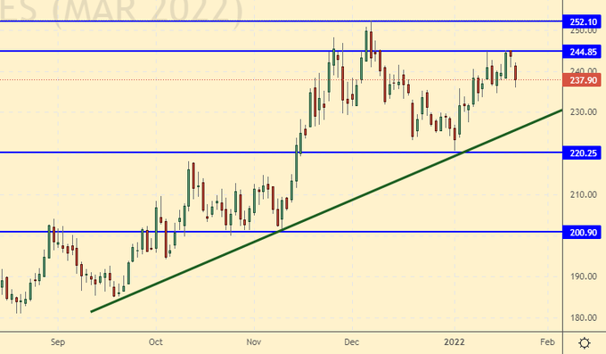 Growth scenario: March futures, the expiration date is March 21. We continue to believe that for purchases we need a fall to the area of 200.0. While out of the market.