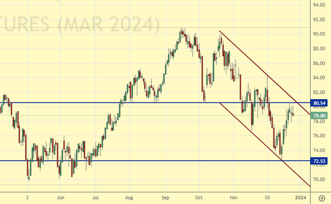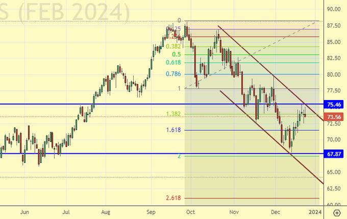 Tensions continue to rise in the Red Sea. The parties are pulling up to the Yemeni coast, whoever has what. Some are ships from the sea side, some are anti-ship systems from the land side, and some are just big firecrackers, so as to create an effect. The oil market, which was generally ready to collapse earlier, now has a new horror story in the form of logistical problems. Note that if Brent consolidates above 80.00 for several days, this may lead to an attempt to break through to 90.00.
