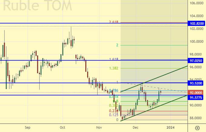 The pair is still above 90.00, which indicates a mild scenario for the development of events if we look at the month of March. It is impossible to deny attempts to reach 80.00 in the spring, but this requires expensive oil and the absence of strong negativity. If we can get above 93.52 before the New Year, then already in the first days of trading in ’24 we will be aiming for a move to 97.00. Otherwise, sellers will try to break below 90.00.