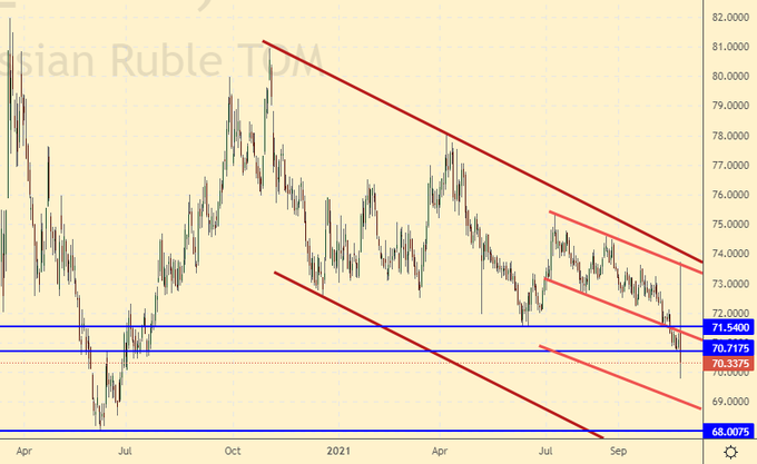 Fall scenario: if the upward shadow on the USD / RUB_TOM pair has closed your positions, then you will have to stay out of the market, since there are no good levels to enter downward now. If you stayed in a position, for example, you are simply preparing rubles to buy dollars at lower levels, then it makes sense to stay in rubles further. Note that there was no upward shadow on futures. If we see a rise in the pair to the level of 72.00, we will sell.