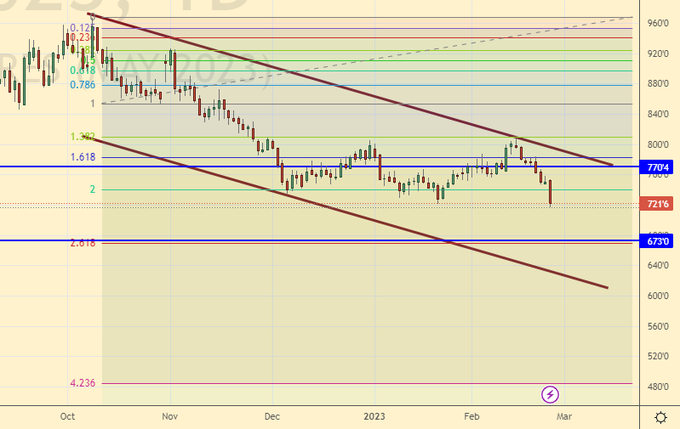 Sale: no. Who is in position from 688.0, move the stop to 678.0. Target: 580.0 cents per bushel.