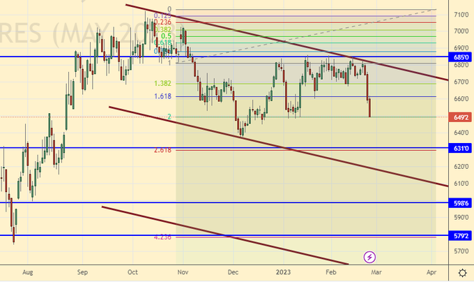 Growth scenario: consider the May futures, the expiration date is May 12. The bulls left the market, which caused prices to fall. It is likely that we will reach the level of 675.0 within this decline. Until we buy.