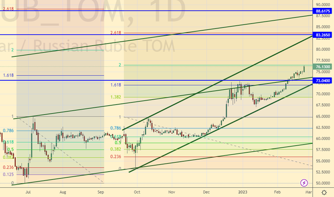 Growth scenario: in terms of technology from 76.10, we can roll back down. The strengthening of the ruble is possible up to the level of 72.00. In the current conditions, we consider a correction to the level of 65.00 a miracle, but this move down remains theoretically possible until we rise above the level of 80.00.