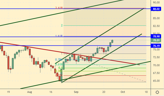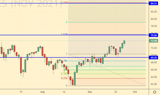 Growth scenario: November futures, the expiration date is October 20. Considering the proximity of the resistance level at 75.56, there is no point in buying now. Who bought after rising above 73.00 — keep long with targets at 84.00.