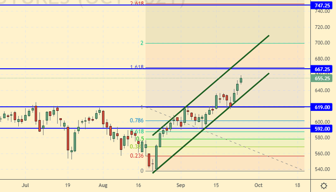 Growth scenario: October futures, the expiration date is October 12. It is possible that the market will roll back from the level of 667.0. If this happens, then shopping opportunities can be considered. Out of the market so far.
