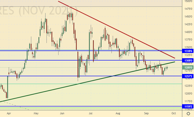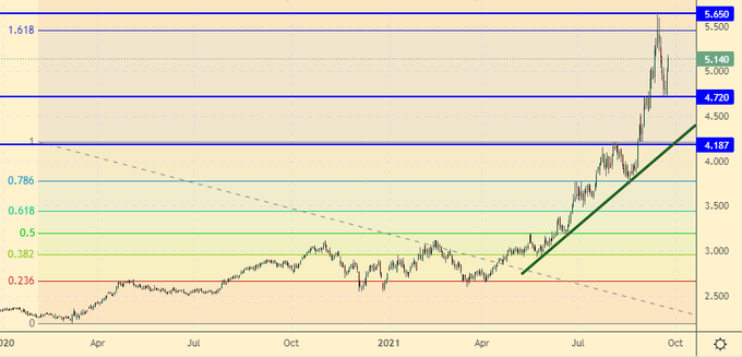 Growth scenario: October futures, expiration date September 28. The gas market in Europe continues to remain at high, one might even say exorbitant levels. Buying now is extremely uncomfortable. For now, we will count on the normalization of the situation and a rollback to 4.220.