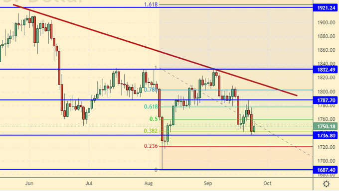 Growth scenario: sellers cannot break below 1730 yet. Buy here, as the risk is small. The FRS meeting on the 22nd only intensified rumors about the strength of the dollar in the distant future, but it never came to concrete cases, in the form of curtailing the quantitative easing program.