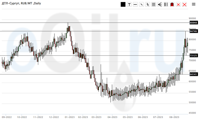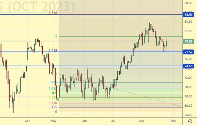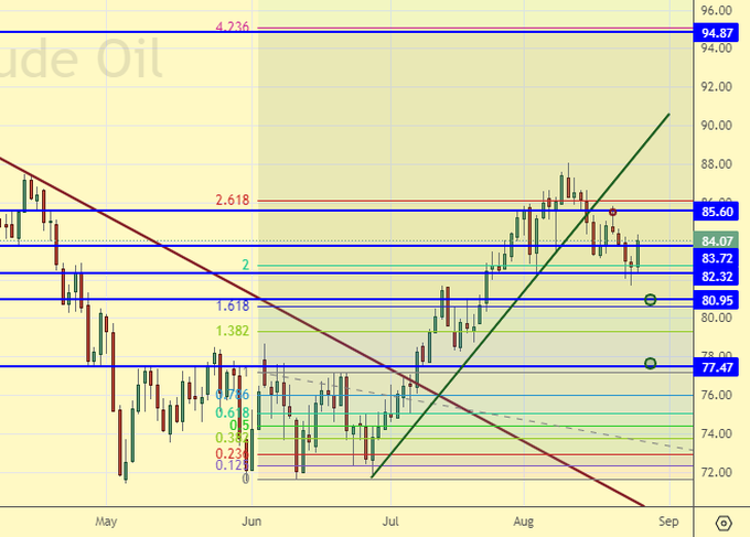 Growth scenario: we are considering the September futures, the expiration date is September 29th. We continue to stay out of the market. Buying from 81.00 and 77.50 make sense.