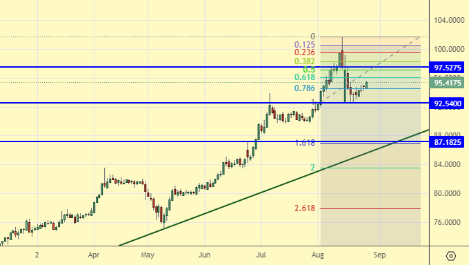 Growth scenario: if the market allows, then it is mandatory to buy from 87.30. If we fix next week above 96.00, we will have to think about buying on the market. And this is not very interesting, but the move to 114.00 cannot be missed.