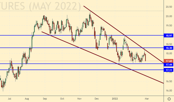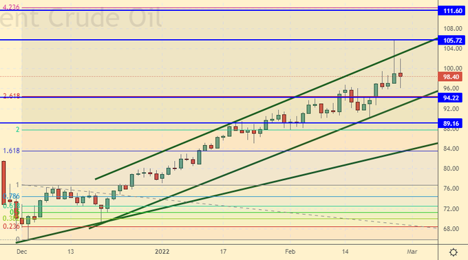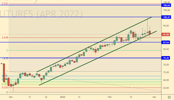 Growth scenario: April futures, the expiration date is March 22. Here you can buy with the target at 106.00. Above this mark, the market is not visible. Falling scenario: selling when approaching 106.00 is mandatory. You can also go short from current levels.
