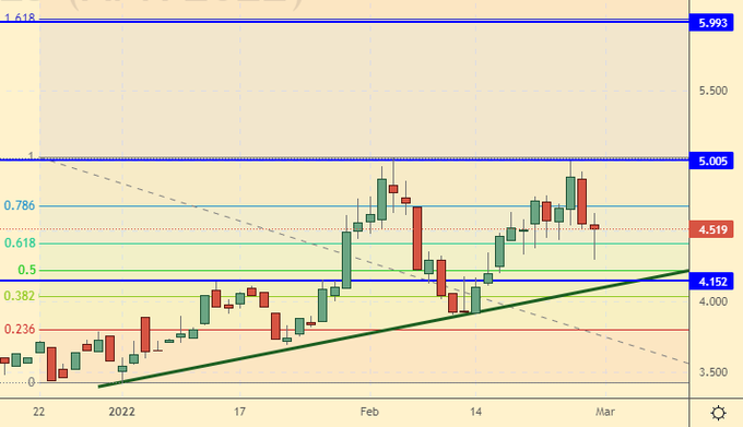 Growth scenario: April futures, the expiration date is March 29. Europe will refuse cheap Russian gas and will buy expensive American. The US has almost a monopoly. And since there is a monopoly, there will be no cheap prices. We hold longs.