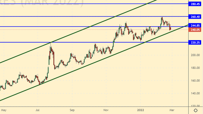 Growth scenario: March futures, the expiration date is March 21. Let’s buy from the current levels. A move to 280.0 is possible.
