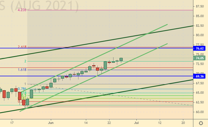 Growth scenario: August futures, the expiration date is July 20. Perhaps touching 76.60, but this is the maximum in this situation. As before, we are outside the market, waiting for a rollback down.