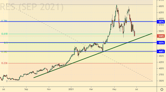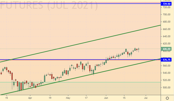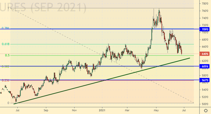 There are buyers at the current levels. Most likely, the market will stop its decline and will not be able to go below 600.0, since it is not clear who will push the market down. There are no sellers on the market. Growth scenario: September futures, expiration date September 14. Most likely buyers will meet the market from 600.0. Sellers will not have enough strength to go lower, as the fundamental background is now in favor of the bulls due to the threat of drought.