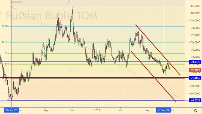The bulls have removed the pressure, and prices continue to go up by inertia. The market cannot grow further without new money. The situation is getting thinner. The likelihood of falling prices is growing. Growth scenario: July futures, expiration date July 30. It is unpleasant to miss long stretches of growth. But we are not chasing the market. We are waiting for a rollback. We expect a fall to 70.50.