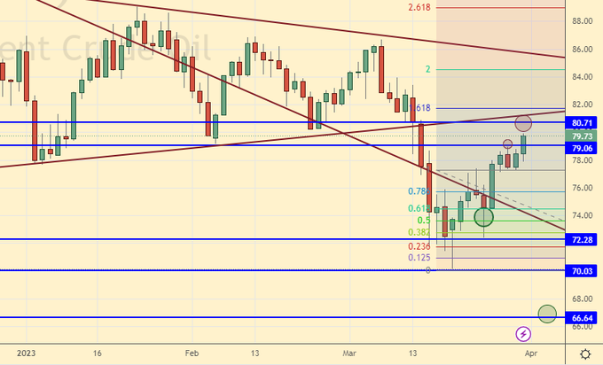 Growth scenario: we are considering the April futures, the expiration date is April 28. The target at 79.00 has been reached. Those who wish can leave buys from 70.10 in order to achieve our long-term target at 110.00, while it is worth aggressively tightening stops.