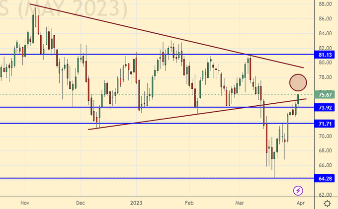 Growth scenario: we are considering the May futures, the expiration date is April 20. Departed at 75.00, rest begs. The market is locally overbought. In case of a rollback to 70.00, you can buy.