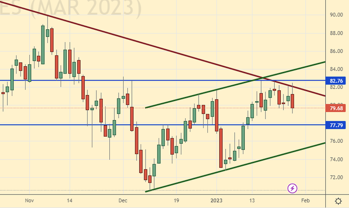 Growth scenario: switched to March futures, expiration date February 21. Failed to go above 82.80. This failure could lead to a downward reversal in the market. Let’s move the stop order closer to the current values.