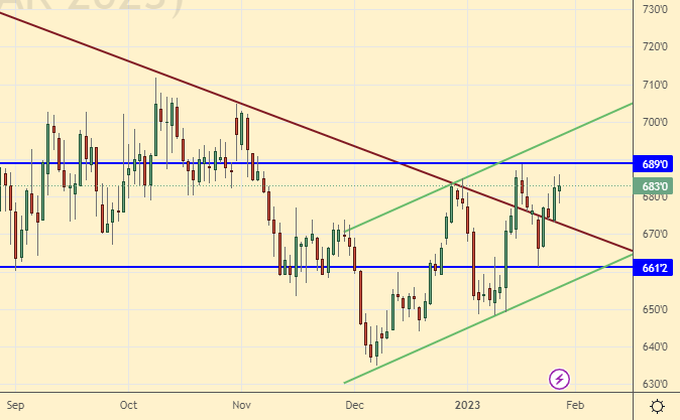 Growth scenario: we consider the March futures, the expiration date is March 14. They try to make us believe that the market will grow. But until we have passed above the level of 780.0 cents per bushel, we will not believe in continued growth. We continue to wait for the market to fall to the level of 650.0.