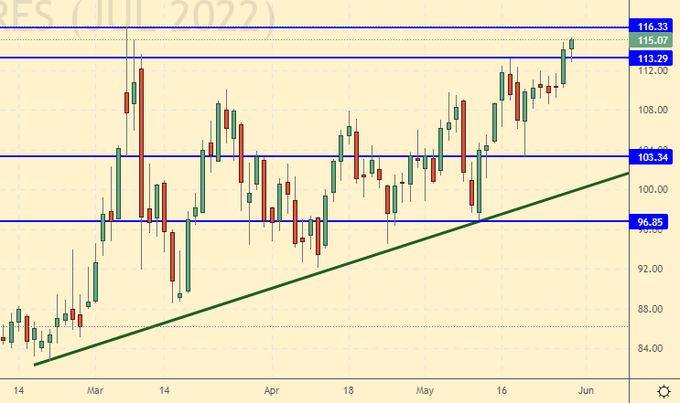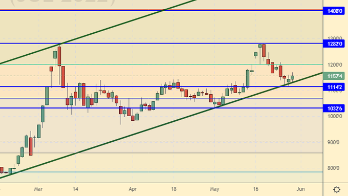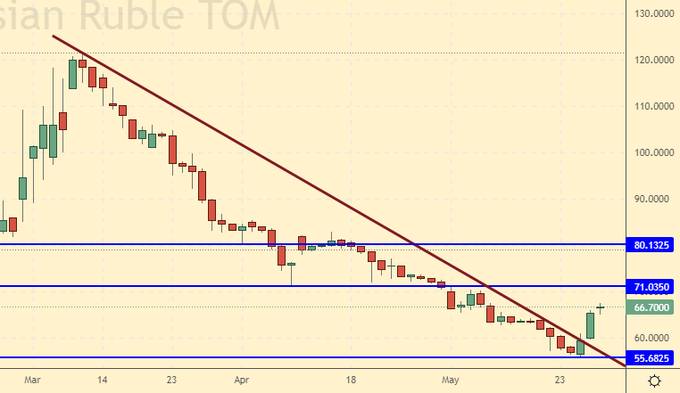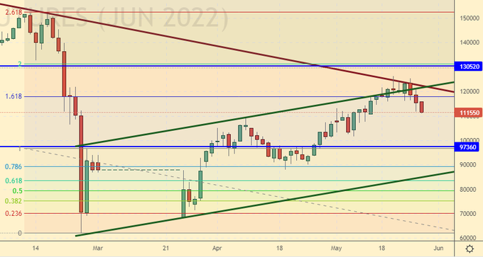 Growth scenario: we consider the June futures, the expiration date is June 30. Let’s continue to hold longs. In the case of a move above 125.00, a jerk to the 150.00 area may follow.