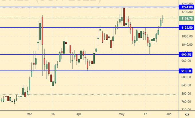 Growth scenario: we consider the June futures, the expiration date is June 10. Oil may drag the market above 1250. The current levels for long entry are too high. Out of the market.