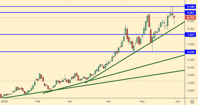 Growth scenario: we are considering the July futures, the expiration date is June 28. We continue to refrain from shopping. Despite the rise in prices to the area of 9.500, we do not rush after the market. Waiting for cooling.