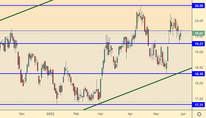 Growth scenario: we are considering the July futures, the expiration date is June 30. We continue to draw price branches that should lead us to 21.60. Stronger growth is not visible yet. We hold longs.